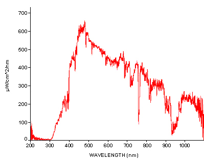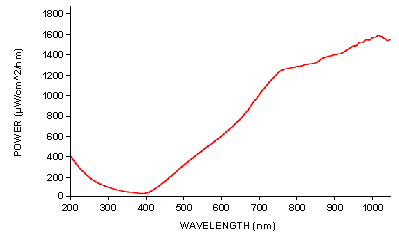 HR4000CG光譜儀使用HC-1光柵,它是一種的可變閃耀波長光柵,提供的波長范圍為200-1100nm。(預(yù)配置光柵的波長范圍為200-1100nm,但是有效的波段是在200-1050nm之間,請參照HC-1光柵效率曲線)。HR4000CG光譜儀還采用了OFLV-200-1100可變長通濾光片以消除二級和三級衍射的影響。光柵和濾光片在出廠時就已經(jīng)安裝并固定。 光學平臺 HR4000CG光譜儀使用"HR"光學平臺,5um入射狹縫,并且升級為UV4紫外窗片,用來增強光譜儀在紫外區(qū)的響應(yīng)。HR4000CG光譜儀是HR2000CG光譜儀的升級產(chǎn)品,使用3648像元的線性CCD陣列探測器,并且在200-1100波長范圍內(nèi)提供好的光學分辨率。 USB2.0和數(shù)字輸入/輸出接口 HR4000CG光譜儀通過USB接口與PC連接,軟件從光譜儀上讀取設(shè)備的配置參數(shù)。HR4000CG光譜儀還提供10個可編程的數(shù)字輸入/輸出接口,一個模擬輸入口和一個模擬輸出口。 HG4000CG的光譜 太陽能光譜